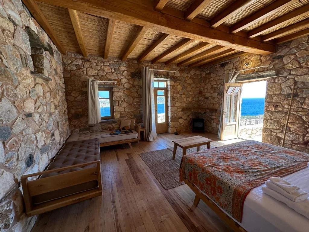 The suite is a 36 sqm room with a king-size bed and a sofa corner, a wooden stove for winter, and Bluetooth speakers. There is a private toilet and a private balcony with an exclusive view of the bay. The room is a sea view and the entrance faces the olive garden. The room has a stone wall and a natural chestnut wood floor with prestigious porcelain finishes.