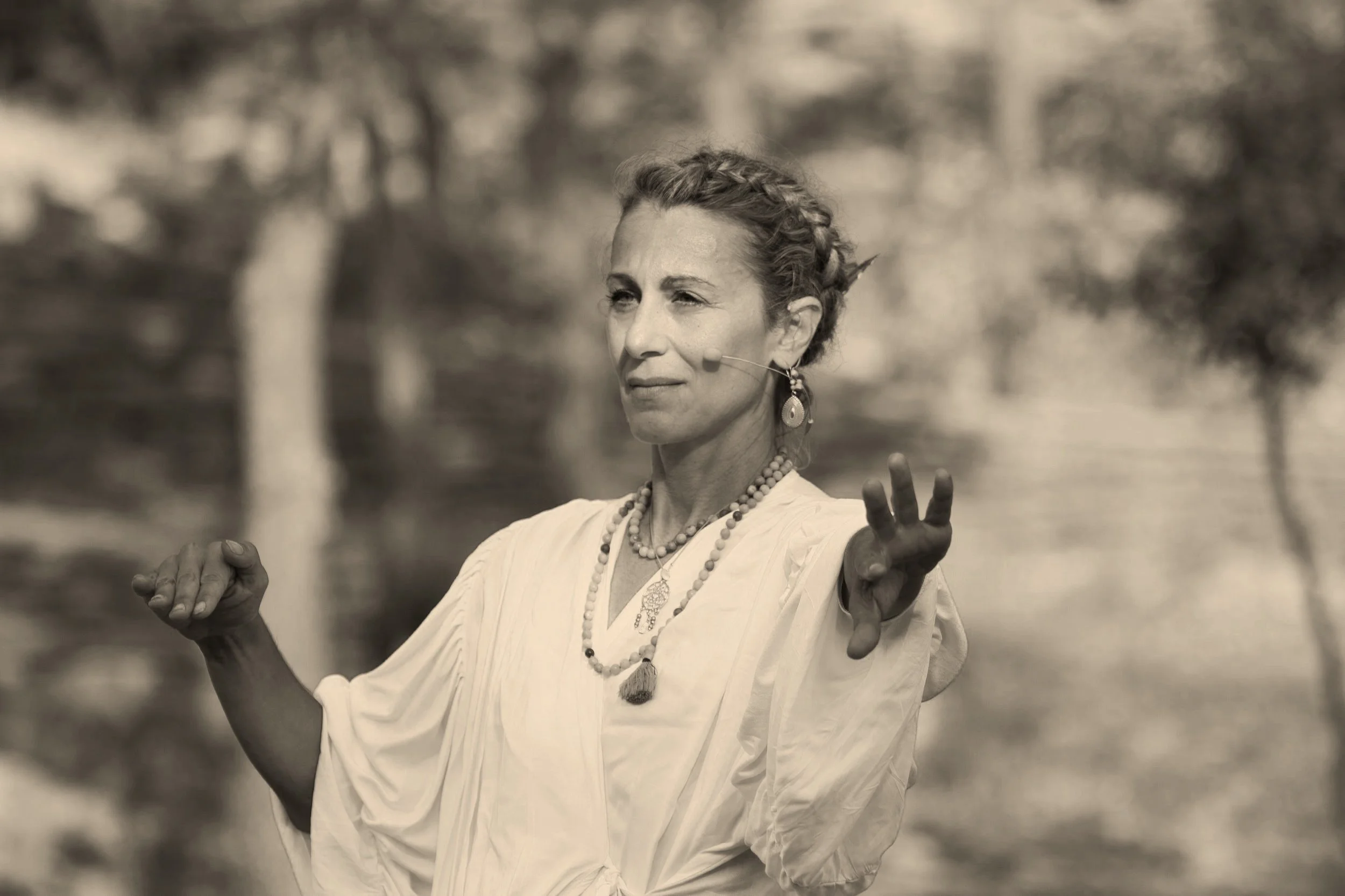 For over 15 years, she has guided individuals and groups through mentorship, workshops, retreats, and online courses, weaving movement, breathwork, mythology, and ritual into transformative journeys of healing and empowerment. She has shared her work worldwide, from intimate circles to large international gatherings such as the Medicine Festival.